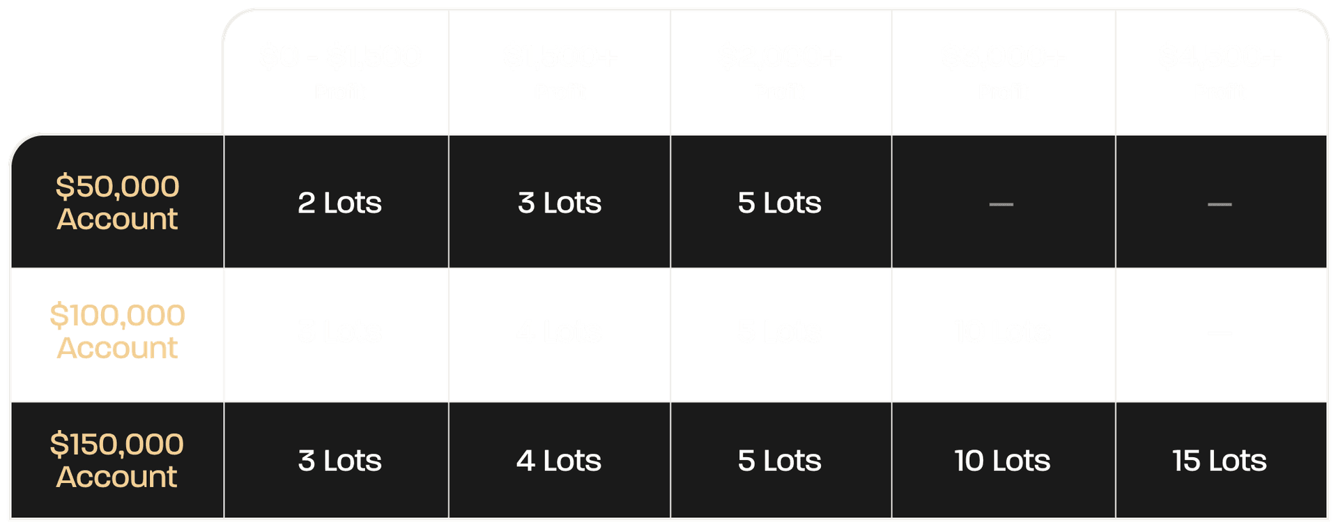 Your contract limit is based on your account balance and follows the Scaling Plan. You’ll start at the lowest level of that plan with the ability to increase your position size based on your profits.
