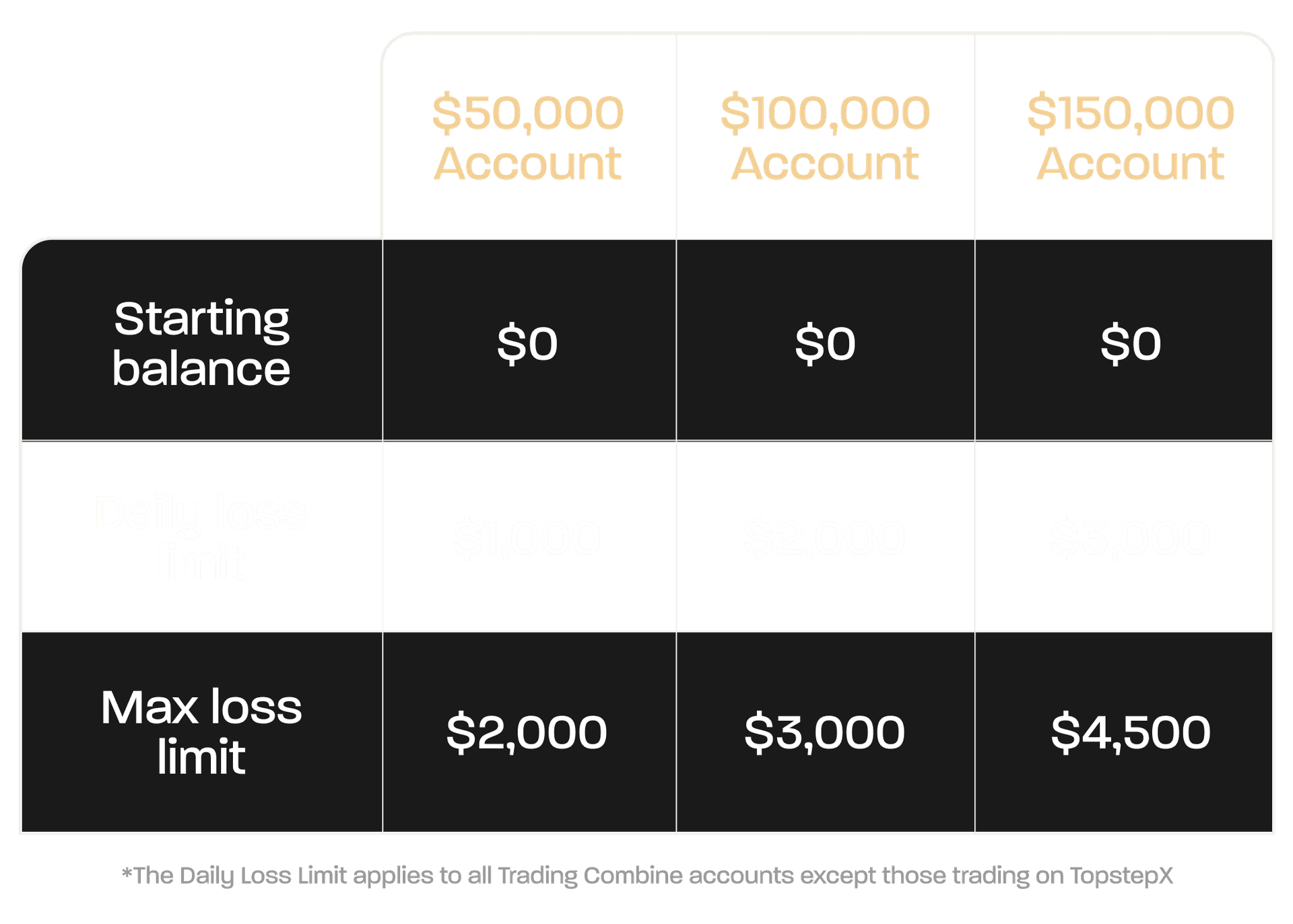 Each Express Funded Account starts with a $0 balance and includes a Max Loss Limit based on your Trading Combine® size: $2,000 for $50K accounts, $3,000 for $100K, and $4,500 for $150K. Your balance can go below $0 to accommodate your Max Loss Limit. If your Max Loss Limit balance increases to $0, your account will lock at $0. Accounts trading on platforms other than TopstepX are also subject to a Daily Loss Limit as outlined below.