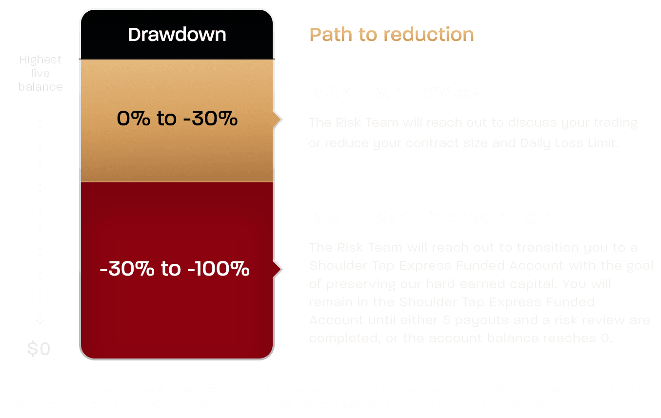 The Path to Reduction is designed to help protect your Live Funded Account during periods of drawdown. If your account balance takes a large drop from its highest balance, our Risk Team will review performance and may reach out with a Shoulder Tap.
